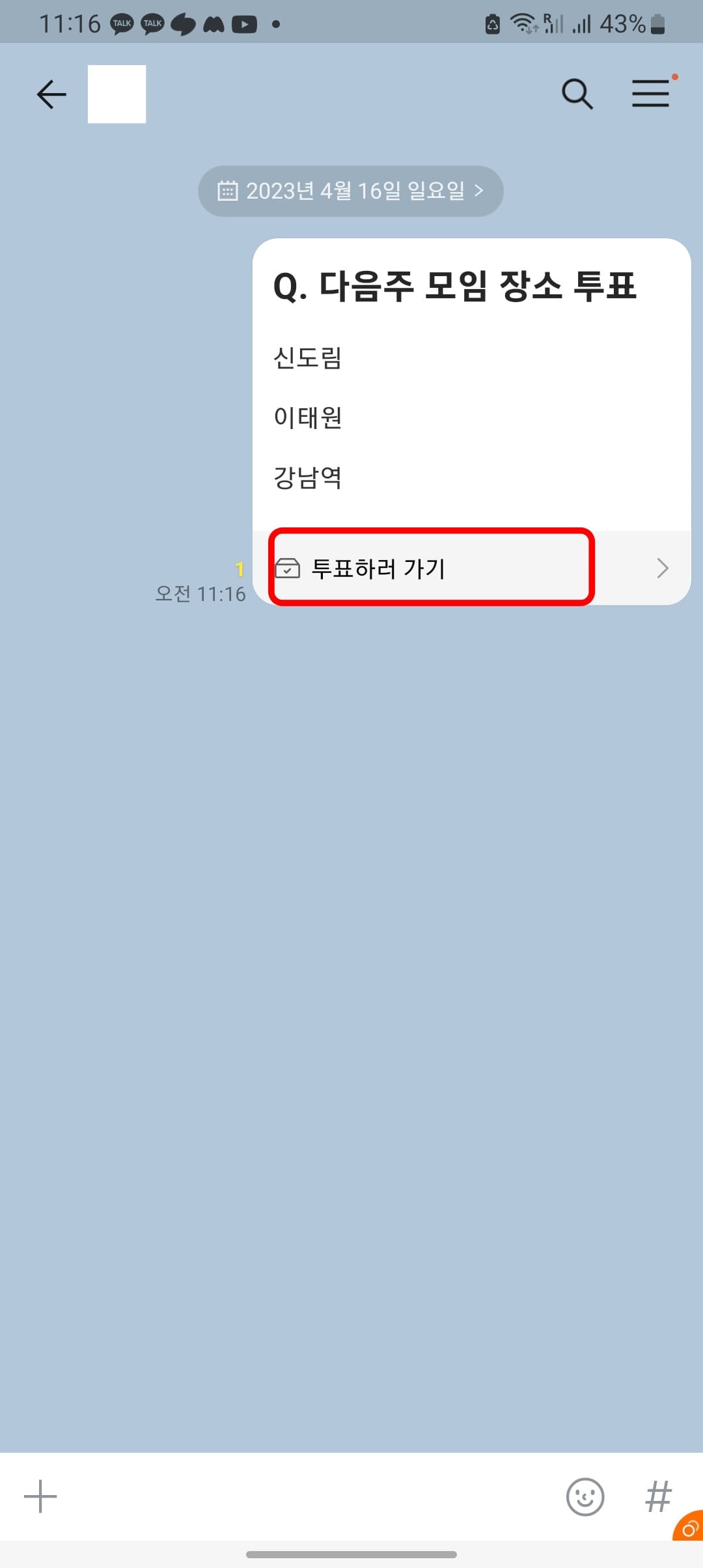 카톡 투표하기는 투표를 생성한 사람이 미리 종료할 수 있는 권한을 가집니다. 생성된 투표창의 투표하러 가기를 터치합니다. 항목을 선택하시고 하단에서 투표하기 버튼을 터치합니다.