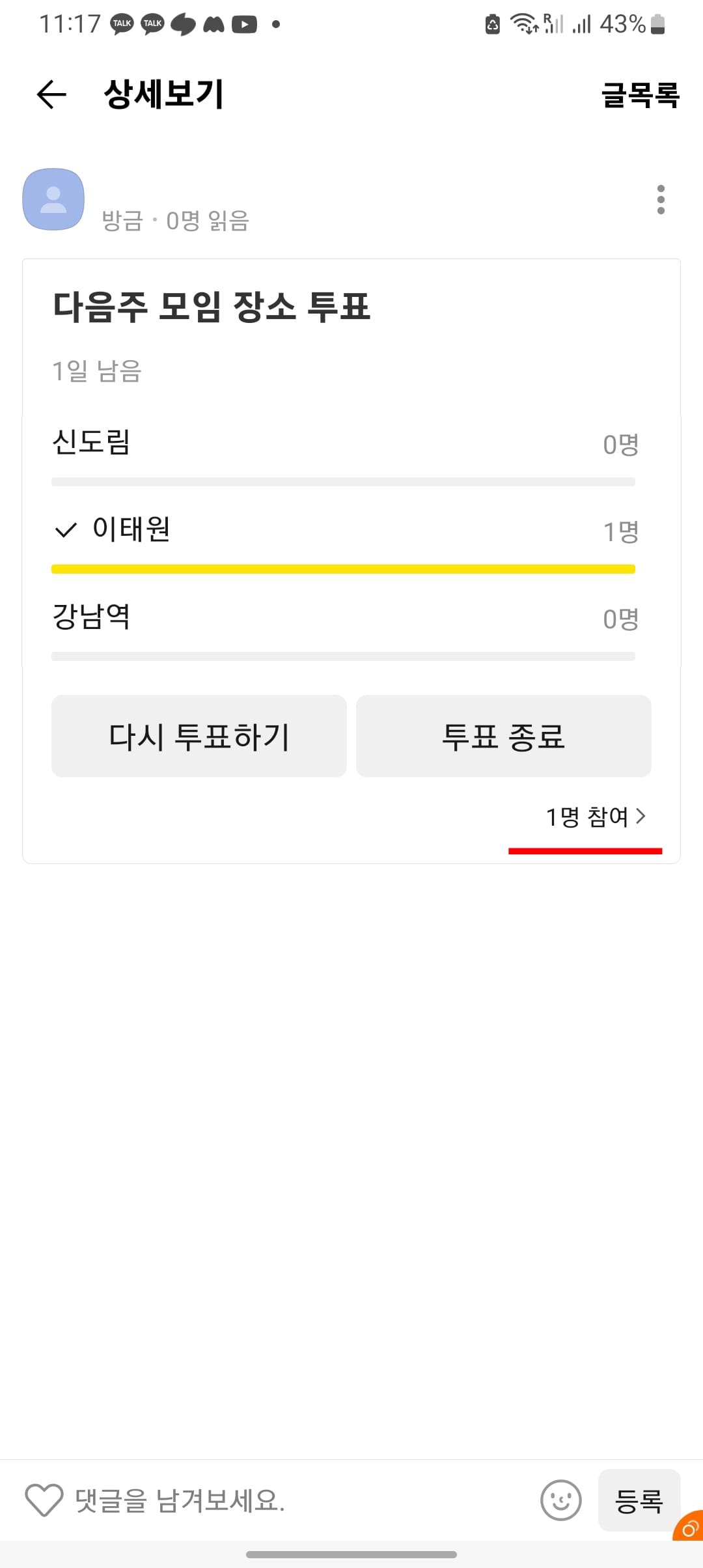 투표를 완료하면 하단에서 1명 참여라는 표시를 볼 수 있습니다. 상대방이 투표에 참여하길 기다립니다. 상대방이 투표에 참여한 결과 2명 참여로 변경된 것을 확인할 수 있습니다. 모든 사람이 투표에 참여하였으니 투표 종료를 터치하여 종료시킵니다.