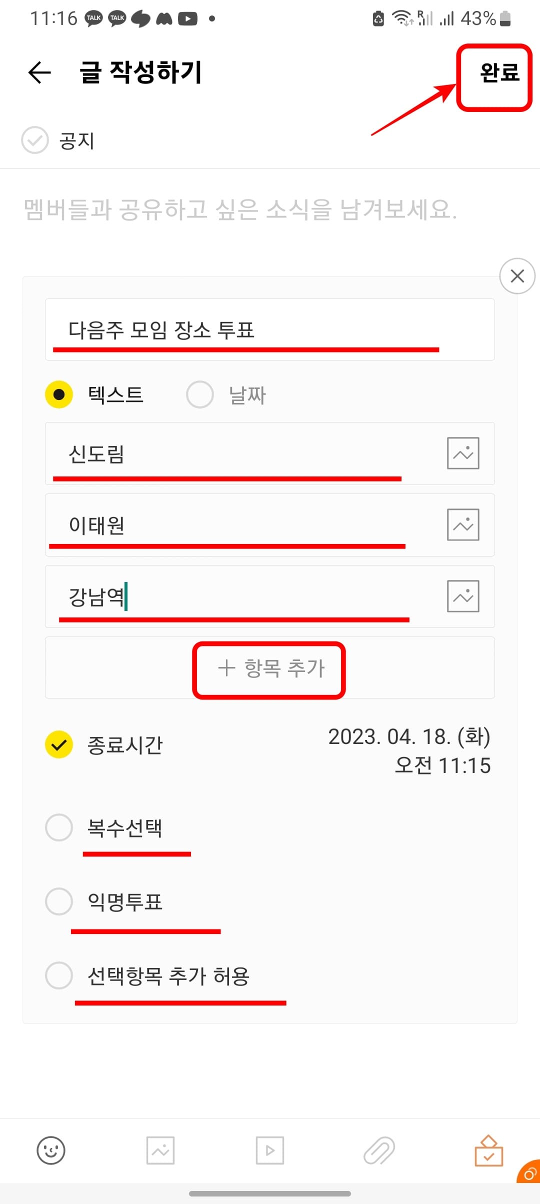 선택항목 추가 허용을 체크하면 투표를 만든 사람 외에도 선택항목을 추가할 수 있다는 의미입니다. 모든 항목을 입력하셨다면 우측 상단의 완료를 터치합니다. 채팅방에 ‘다음주 모임 장소 투표’ 창이 생성된 것을 확인할 수 있습니다. 이어서 투표하는 방법에 대해서 알아보겠습니다.